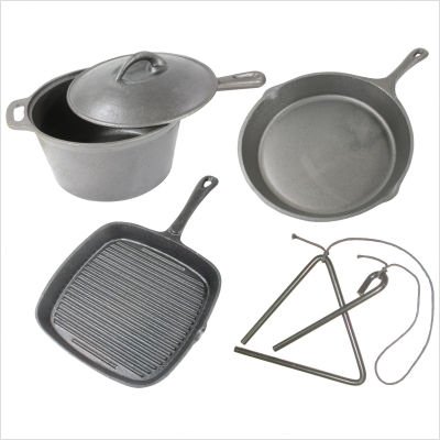 CICSET5 Features: -Set includes: 12'' skillet, 10'' square skillet, 3 quart sauce pan with lid and old time dinner bell. -Comes pre-seasoned. -Construction Material: Metal. -Dimensions: 6.5'' H x 11.5'' W x 15.5'' D.Available at Amazon Check Price Now!