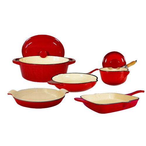 The 7 Piece Cookware Red Set is evenly conduct and retain heat while withstanding the rigors of daily use. Porcelain enamel interior finish requires no seasoning and resists scratches and chips. Goes easily from oven to table for beautiful presentation. High quality porcelain enamel coating is impermeable to odors and stains. Heavy duty cast iron construction for great cooking and a century of use. No seasoning require. Safe on all cook tops and in the oven to 475 degrees F. Hand washing is recommended to preserve the cookware's original appearance. Else flat bottoms are enameled as the two tone red exterior. Limited Warranty. Specifications:7-qt. Oval Dutch Oven: 13 1/4"Length (Not INCLUDE the handles) x10 1/2" Width x 4 1/2" Depth.1 1/2-qt. Sauce Pan.10 1/2-Inch Square Grill Pan: Length10 1/2"x Width 10 1/2"x Depth 1 3/4" 11-Inch Round Skillet: Length19"x Diameter 11"x Depth 2 1/4" 13-Inch Oval Roasting Dish: Lenth 13 1/2"x Width 8 1/4"x Depth 2".